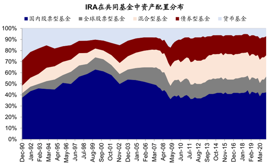图表: IRA在共同基金中的资产分布主要以国内股票基金为主,截止2020年末,占比高达43%