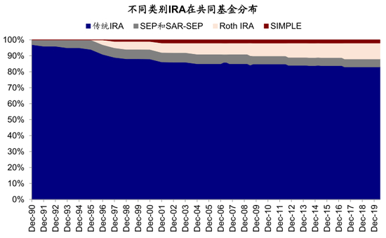 图表: 从体量上来看,IRA在共同基金中的分布主要以传统IRA为主,截止2020年末,占比高达83%