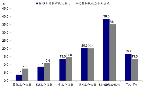 图表: 2017年各收入区间转移和税收前后收入占比