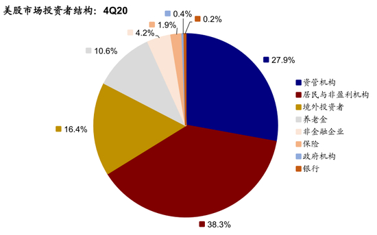 整体看,多少人群受资本利得税影响?根据FINRA发布的2019年美国投资者研究报告显示,2018年,美国大约有32%的人群拥有非退休账户(non-retirement account),即在401(k)和IRA等养老金账户外有普通的经纪账户(brokerage account),而这样的经纪账户是在兑现收益时是需要缴纳资本利得税的。进一步来看,就股票市场来讲,在这些普通经济账户中,根据FINRA统计,投资于股票类资产的账户约占74%,因此,可以推算出大约有24%的人群直接持有股票类资产,因此在兑现股票收益时需要缴纳相应的资本利得税。根据美联储统计,美国资管机构、养老金及境外投资者持有股票占比也在逐年抬升,截止4Q20,资管机构持股占比27.9%、境外投资者为16.4%、养老金为10.6%。而拜登此次上调资本利得税率仅针对居民,这三类机构持股占比较高的机构将不会受到直接影响。