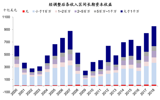 图表: 2008年金融危机后,伴随美股的长牛,收入最高1%的家庭资本收益规模也在逐年攀升
