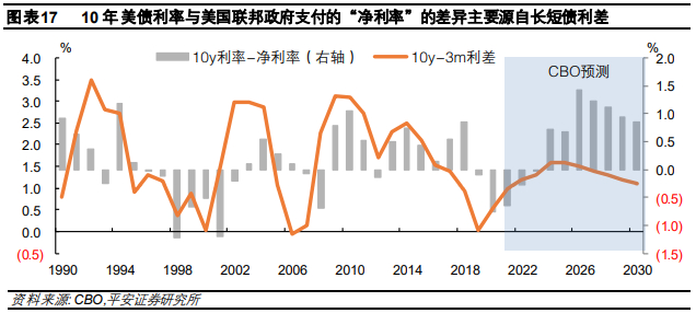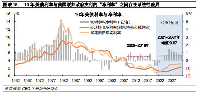 首先需注意,10年美债利率不等于美国联邦政府融资的“净利率”。一般认为,10年美债利率是各期限国债利率的锚,10年美债利率上行,将带动各期限美债利率同步上行,加大财政利息支出、继而加大利息净额支出。但实际上,10年美债利率与美国联邦政府融资的净利率(即最终支付的净利息占债务总额比例)并非完全相关。从数据上看,1986年以前10年美债利率与“净利率”差额可达到2-5个百分点;1986年以来这一差值平均为20bp;次贷危机后的十年(2009-2018年)平均为54bp。根据CBO预测的10年美债利率、利息净额和公债总额,预计疫情后的十年里(2021-2031年)该数字平均为67bp(图表16)。