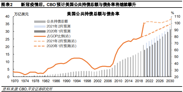 1、美国国家债务或有“远虑”。2020年美国新增4.2万亿美元债务,联邦债务率(公共持债总额/GDP)突破100%。债务量积聚必然加剧偿债压力,随着利率水平恢复,CBO预计2030年以后利息支出将直线上升,预计2051年联邦净利息支出占GDP的8.6%,总支出将占GDP的31.8%,为二战以来的最高水平。