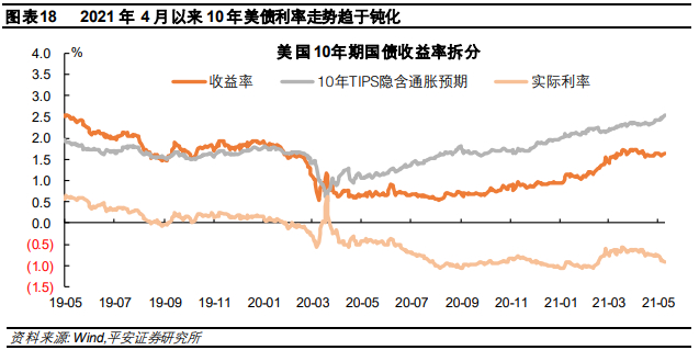 2021年4月以来10年美债利率走势趋于钝化,预计全年平均值为1.6-1.7%。2021年2-3月10年美债利率上行斜率较陡、一度升破1.7%,但之后在美联储的政策引导下,美债利率上行节奏放缓,甚至在4月上旬出现下行,近期利率稳定在1.6%附近。拆分来看,近一个月10年期TIPS利率(实际利率)平均约为-0.8%,而隐含通胀预期(名义利率-实际利率)平均为2.39%,符合美联储的引导,美联储3月公布的2021年通胀指标(PCE)同比预测中值为2.4%(图表18)。我们认为,如今的美联储十分注重与市场沟通,即使2021年下半年美联储释放有关削减QE的信号,10年美债利率或出现上行、但走势可能保持相对平稳。且由于年初10年美债利率仍处于低位,1月和2月平均利率为1.08%和1.26%,1-4月均值为1.4%,我们预计2021年10年美债平均利率为1.6-1.7%。