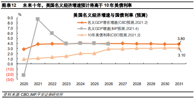 未来十年,美国GDP名义增长率或高于美国财政部发债的平均利率,美国债务可持续性的前景并不悲观。CBO在2021年2月预测,美国未来十年(2021年以后)名义GDP潜在增长率基本保持在3.8-4.0%区间。IMF在今年4月更新预测,预计2021和2022年(由于低基数原因)美国名义GDP增速分别为8.65%和5.92%,2023-2026年名义增速可保持在3.86-3.96%区间。而据CBO预测,2020-2030年左右10年美债利率最高仅能达到3.1%(图表12)。而且,考虑到10年美债利率一般高于美国财政部发债的平均利率(图表7)、尤其在2020年美联储降息之后(图表8),美国联邦政府实现债务可持续所对应的名义GDP增长下限还能进一步放松。因此保守估计,如果未来美国名义GDP增速能够保持在3%以上,经济体量的增长就能覆盖美国债务净利息支出的增长,即实现美国联邦政府的债务可持续。