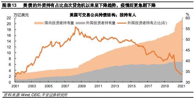 与次贷危机后不同,2020年增发的美债大部分被美国国内投资者持有,外债付息压力进一步减小。通常而言,外国投资者持有的债务更受公众关注。原因在于,支付给外国投资者的利息是“泼出去的水”,难以收回;而支付给国内投资者的利息,或可通过加税等财政手段加以缓解。2008-2010年次贷危机后,美国大举增发债务,而外国投资者亦相应增加了购债规模,外资持债比例保持在50%以上;之后十年里,美国债务规模扩张速度持续高于外资购债速度,外资持有美债占比呈下降趋势,2019年已降至40%。2020年新冠疫情以后,虽然大量新增美债流入市场,但外资持有规模未出现明显增长,基本保持在7万亿美元水平,致使外国持有美债的占比由疫情前的43%,急剧下降至2021年年初的34%(图表13)。考虑到美债利率降低,可以判断美国在疫情后的债务扩张并未加剧外债付息压力。
