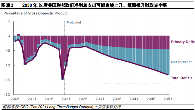 中长期看,债务积聚加剧偿债压力,预计2030年以后美国联邦政府债务利息支出将直线上升。据CBO在2021年3月的长期预算展望,2021年美国赤字水平仍将维持高位,之后几年将回归至正常水平(5%以内);然而2030年以后,随着利率水平回升,美国联邦债务的利息净支出将迅速增加,财政赤字率将急剧攀升。CBO预计,2032–2041年和2042–2051年的两个十年里,平均净利息支出占美国GDP比重将分别达到4%和7%,相应财政赤字率将被推升至7.9%和11.5%(图表3)。预计2051年美国联邦利息支出占GDP的8.6%,联邦总支出将占GDP的31.8%,为二战以来的最高水平(二战后的三年里联邦总支出占GDP的40%以上)。