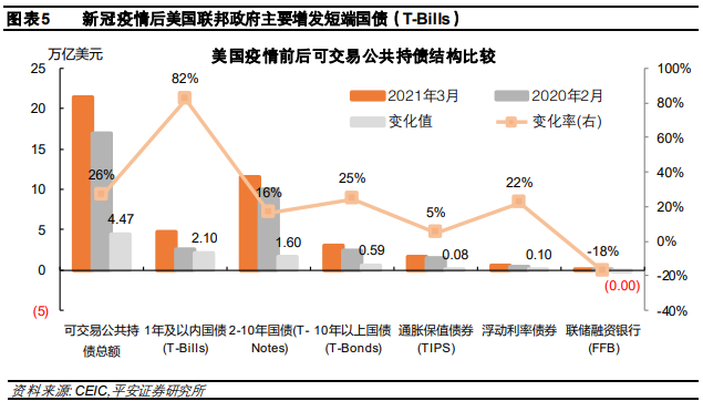 新冠疫情后美国联邦政府主要增发短端国债(T-Bills)以配合临时性财政支出。2020年2月至2021年3月,市场上共增加4.5万亿美元的可交易公债,增幅为26%。其中,1年期及以内的短端国债(T-Bills)增加了2.1万亿,增幅为82%,约占新增发公债总量的“半壁江山”;2-10年(包括10年)期的中长端国债(T-Notes)增加了1.6万亿,增幅仅为16%;10年期以上超长端国债(T-Bonds)仅增加0.6万亿,其余类型债券增加不到0.2万亿(图表5)。