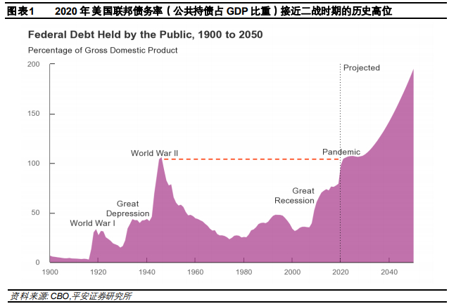 2020年新冠疫情冲击下美国联邦债务率急剧攀升。2020年公共持有的美国联邦债务(debt held by public, 下文简称“公共持债”,指个人、公司、州或地方政府、联邦储备银行、外国政府和美国政府以外的其他实体持有的所有联邦债务,不包括州和地方政府债务)总额达到21万亿美元,比2019年增加了4.2万亿;同比增长25%,增幅仅次于2009年的30%,2013-2019年同比平均仅增长6%。2020年美国联邦债务率(公共持债总额/GDP)达100.1%,2019年债务率仅为79.2%。2020年联邦债务率已经接近二战时期106%的历史高位(图表1)。