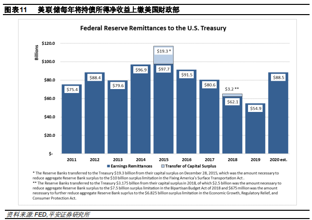 而且,美联储将把持有国债所得利息净收益上缴财政部,意味着新增中长期国债几乎“零成本”。美联储作为非盈利机构,其利润(即持有各类国债所得利息收入扣除成本后)需上缴国库。据美联储在2021年1月估算,2020年美联储净利润达888亿美元,向美国财政部上缴利润885亿美元,比2019年多上缴336亿美元(图表11)。这意味着,疫情后增发的中长期国债,对于财政部而言可能都是“零利率”融资,财政部中长期债务平均成本进一步下降。