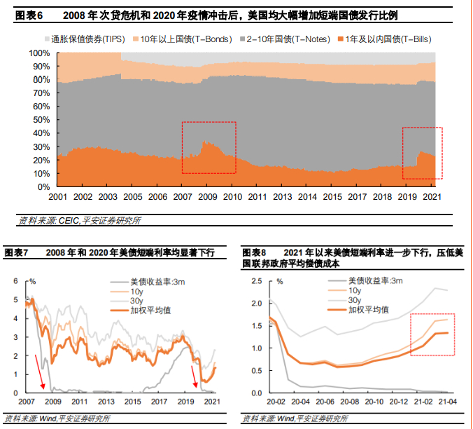 疫情以来,美联储基本上买走了财政部增发的全部中长期国债。美联储在2020年3月后推出“无限量”QE,5月后维持每月800亿美元的国债购买。2020年2月至2021年3月期间,美联储共增持国债2.5万亿美元,约占美国财政部新增债务总量的55%。其中,美联储增购的基本上是中长期国债(1年以上),规模达2.2万亿,基本等于同期财政部增发的中长期国债(图表9)。自2020年3月降息后,美联储放弃短端国债的购买,截至目前仅持有3260亿美元,即财政部在2020年2月之后累计增发的2.1万亿美元短端国债,基本上全部流入市场(图表10)。这意味着,美国财政部正在享受极低成本的私人部门融资,且同时,美联储的大规模买入进一步控制了中长端美债利率,压低了中长期的债务融资成本。