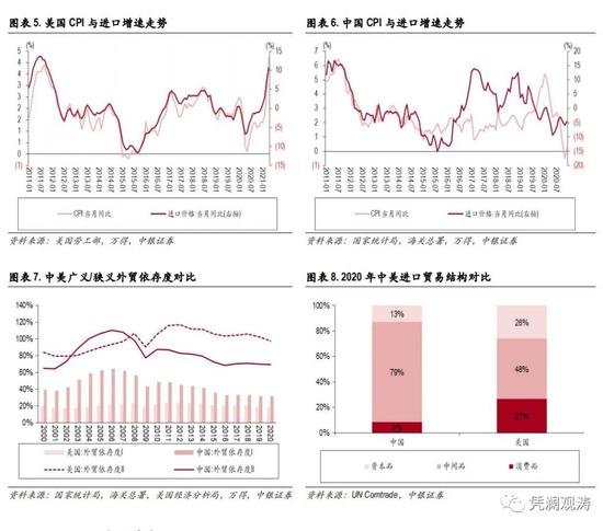 在全球化背景下,通货膨胀可由国际贸易渠道传递到国内,即通过进口商品价格的波动影响国内物价水平。我们观察2011年1月至2020年12月期间中美CPI和进口价格增速发现,美国CPI和进口价格增速走势基本一致,二者相关系数高达0.94(见图表5);而同期中国CPI和进口价格增速走势从一致走向分化,二者相关系数仅为0.46(见图表6)。这可能反映了,美国CPI受进口价格变动的影响较大,中国进口价格并非CPI的主要影响因素。由于难以计算两国CPI篮子商品的对外依存度,我们对比分析中美两国的外贸依存度和进口贸易结构。