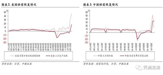 原因一:中美供需复苏节奏不同。在一系列财政刺激计划以及疫苗接种的共同影响下,美国需求复苏明显快于供给。而中国供给端恢复较快,需求恢复速度偏慢,制约了CPI上涨空间。
