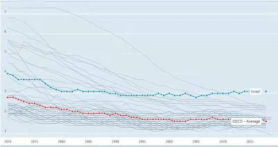 1970年至2019年以色列与OECD国家平均生育率趋势比较(来源:经合组织)