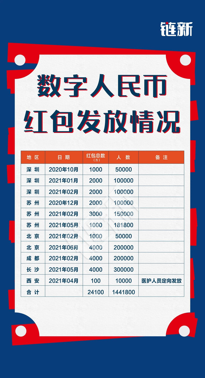 据《链新》统计,算上北京即将开展的活动,北京、长沙、深圳等6地区合计发放2.4亿元的数字人民币的红包,用于数字人民币的推广,涉及人数超过百万。