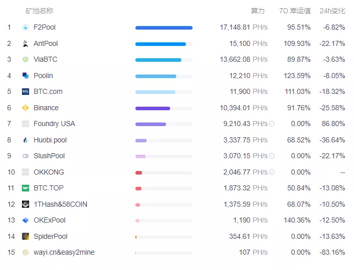 btc.com数据显示,当前比特币全网平均算力126.83EH/s,相比历史最高点197.61EH/s(5月13日)已经跌去近36%。同时,Huobi Pool、Binance、AntPool及Poolin等具有中国背景的比特币矿池算力急剧下降,近24小时算力下降幅度分别是36.64%、25.58%、22.17%、8.05%。
