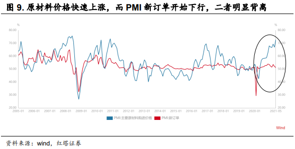 从数据来看,5月PPI同比高达9%,而CPI同比仅为1.3%,无论是PMI原材料价格减去产成品价格还是PPI原材料价格同比减去PPI加工价格同比都创下了历史新高,这说明下游生产制造环节在不断忍受着上游的通胀。