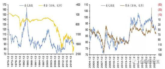 图1:黄金价格和美元指数 图2:石油价格与美元指数