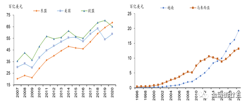 全球贸易合作关系已悄然变化。美国前总统任职期间,原有WTO框架下的全球化进程陷入停滞,加之新冠疫情的冲击,全球化前景陷入悲观,而区域经济体、盟友经济体等模式成为国际贸易主流,以价值链为基础的贸易区域化得到发展。2020年,东盟超越美国和欧盟,历史性地成为中国最大的贸易伙伴。2016年起,中国和越南双边贸易额远远超过中国与马来西亚的贸易额,这说明地理距离临近的国家在适应价值链重构中的能力。