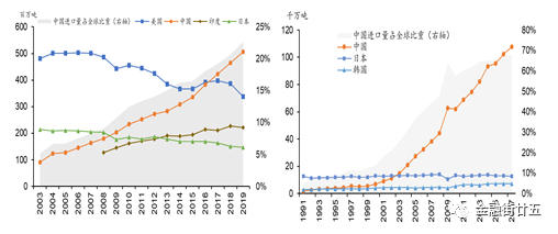 随着经济的快速发展,我国已成为全球第二大经济体,同时也是大部分大宗商品的主要进口国和消费国。其中,2009年起,我国超过日本成为世界第二大原油进口国,2017年超过美国成为世界第一大原油进口国,进口量占比接近全球25%;1993年起,我国超过韩国成为世界第二大铁矿石进口国,2003年起超过日本成为世界第一大铁矿石进口国,进口量接近全球70%。