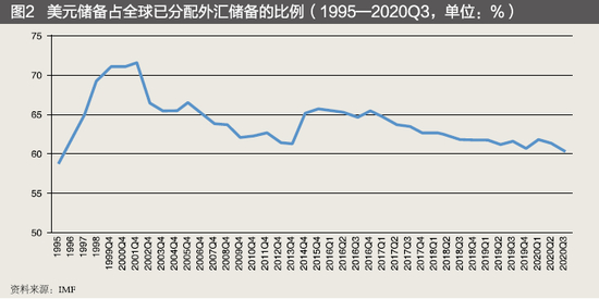 本文试图讨论的问题是,美元指数强弱与美元储备在全球外汇储备中的占比之间的关系,从而反映出美元强弱不能完全代表美元信用的高低。图1显示了美元指数波动幅度很大,在1995年至2020年第三季度,美元指数基本在70~120之间波动。在1995—2001年美元指数上升区间,美元外汇储备的占比有明显的上升,大约上升了10个百分点。但在2011年年底至2017年美元指数的上升期,美元储备占比基本没有变化(见图2),美元占全球外汇储备基本稳定在60%以上的水平。2020年第三季度,美元储备占全球已分配外汇储备约60.5%,这一数据处于1995—1996年之间的水平。换言之,25年间美元指数呈现较大波动,但美元储备占全球外汇储备的比例基本没有变化。