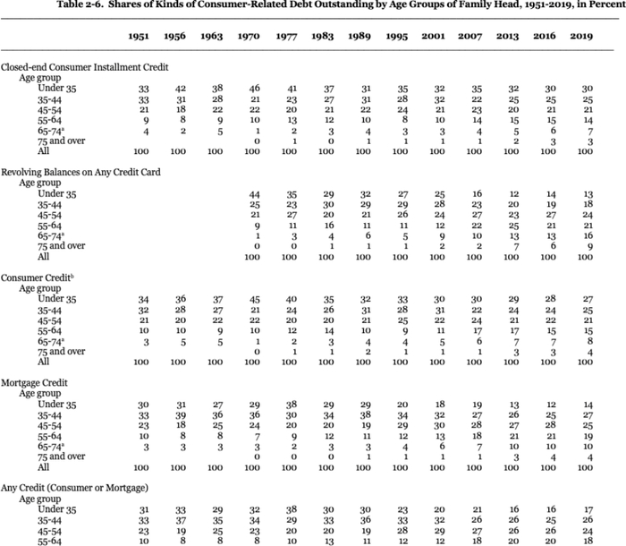表2-4:1951—2019年按户主年龄组分列的使用与消费者有关的信贷的家庭比例,百分比