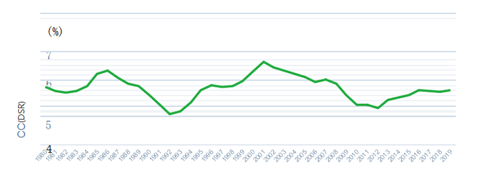 该图显示,自1950年代以来,消费信贷总额一直保持在家庭部门金融资产总额的4%至5%。自20世纪60年代初以来,未偿消费信贷始终保持在家庭部门流动资产(存款和接近替代品)的五分之一至四分之一左右(图中未显示)。最近(2019年),这一衡量标准大约处于这段时间内的中间位置,为22%。