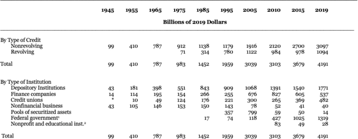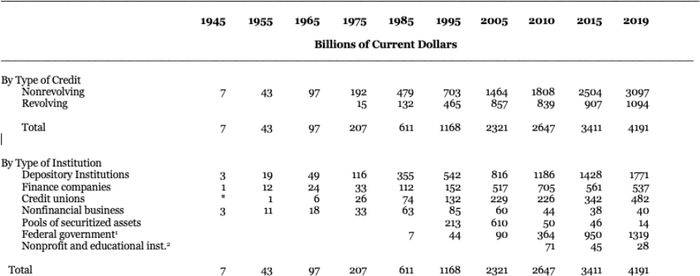 消费信贷在今天看来当然很重要。美国国内未偿消费信贷(不包括抵押贷款)从1945年底和战时限制时的约68亿美元(按2019年美元计算约990亿美元)上升到2019年底的4.2万亿美元。
