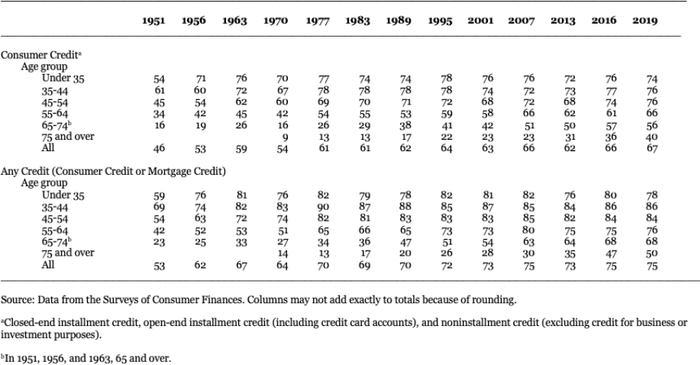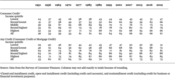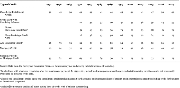表2-2:1951-2019年使用信贷的家庭比例,百分比
