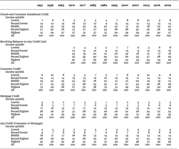 表2-3:1951—2019年按收入组别分列的使用与消费者有关的信贷的家庭比例,百分比