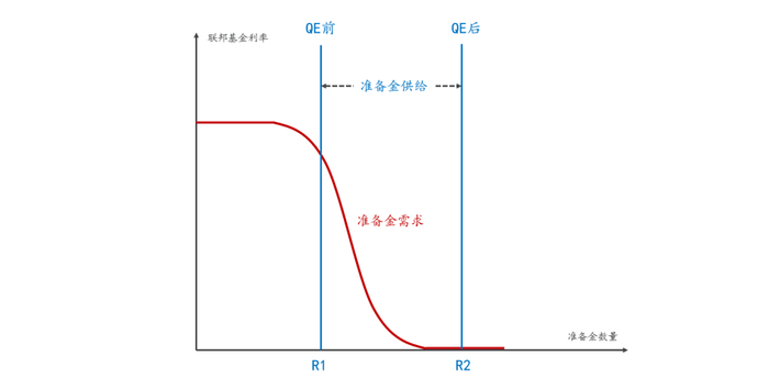 金融危机之前,对于给定的准备金需求,FOMC可通过调整准备金的供给,来实现联邦基金利率的目标,并以此向其他短期和长期利率传导,通过资金价格影响实体经济。但是,金融危机之后的3轮QE,将准备金供给从R1向右移动到R2(图2)。只有开展大规模的公开市场操作,回收(或冻结)足够多的准备金,才能抬升利率。