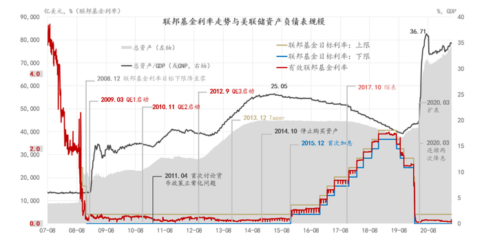 2017年10月,美联储开始缩表,规模季度累进:每月减持的国债规模起点是60亿美元,每3个月增加60亿美元,直到300亿美元上限;减持的MBS初始规模是40亿美元,每3个月增加40亿美元,上限为200亿美元。按计划,从2018年10月开始,美联储将按照每月500亿美元的规模匀速缩表。实际操作基本按这一计划执行。至2019年9月停止缩表时,美联储总资产降到了3.7万亿美元,比2017年10月减少了0.8万亿美元。其中,持有国债规模从2.5万亿降到了2万亿美元,完成率为98%,持有的MBS规模从1.8万亿降到了1.5万亿美元,完成率100%。
