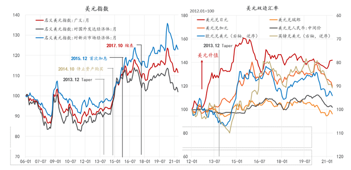 2008年金融危机期间,人民币重新盯住美元,直到2010年6月19日才开始逐步解除。此后,直到“8•11”汇改,人民币有效汇率和人民币兑美元双边汇率呈现出同步、单边升值状态,这与美元指数显著背离,也因此积聚了贬值预期。