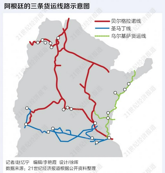 阿根廷目前有贝尔格拉诺、圣马丁和乌尔基萨三条货运线路,在国家货运线几十年的疏虞之后,对贝尔格拉诺负载测试令人振奋,经过近八年三届政府的持续努力,阿根廷终于初见铁路历史性重启的复苏。