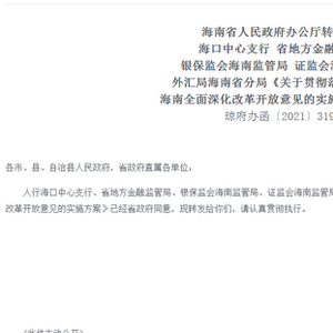 人行海口中心支行、省地方金融监管局、银保监会海南监管局、证监会海南监管局、外汇局海南省分局《关于贯彻落实金融支持海南全面深化改革开放意见的实施方案》已经省政府同意,现转发给你们,请认真贯彻执行。