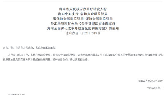 海南省人民政府办公厅转发人行海口中心支行 省地方金融监管局银保监会海南监管局 证监会海南监管局外汇局海南省分局《关于贯彻落实金融支持海南全面深化改革开放意见的实施方案》的通知琼府办函〔2021〕319号