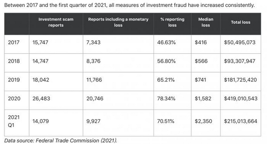 根据美国联邦贸易委员会(FTC)数据,继2020年加密货币诈骗损失造成4.19亿美元的损失后,2021年将是投资欺诈创纪录的一年。 2021年第一季度,FTC就已收到14079起欺诈报告,同期损失数值达2.15亿美元。