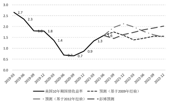 预测模型结果认为,美国十年期国债收益率在今年三季度继续上升,基于2009年的期限溢价预测值,十年期美债收益率会在三季度触及高点,升至1.7%,之后缓慢下降,在明年一季度降至1.4%,之后再缓慢上升。基于2012年的期限溢价预测值,十年期美债收益率在今年四季度升至2.1%,意味着今年的下半年美债收益率上升压力较大,之后,美债收益率在明年全年快速下行,在2022年四季度降至1.6%。