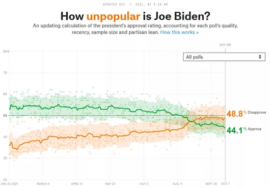 2) 由于明年将迎来中期选举,民主党不希望单独被打上提高债务上限的标签,尤其在近期拜登总统支持率的不断下滑的背景下(图表10)。因此,原本民主党是寄希望于和共和党一起达成暂时性冻结债务上限的,但如果无法得到共和党支持的话,只能转而独自使用预算调节程序来上调债务上限到某一个规模,或者直接启动所谓的“核选项”。