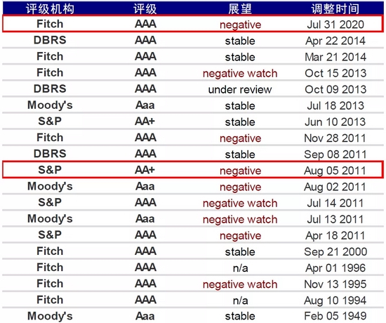 图表12:2011年8月债务上限危机时,标普公司就将美国主权评级从最高的AAA降至AA+;2021年7月31日,惠誉对美国评级展望下调为负面(negative)