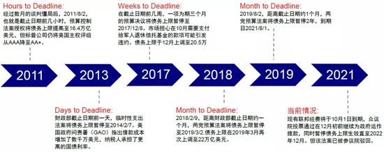 9月底到10月中,美国面临一系列重要的财政政策节点,如此前已通过参议院的5500亿美元基建投资、包含加税计划的3.5万亿美元支出方案、10月1日新财年拨款法案(最后一刻通过临时拨款法案给政府提供资金至12月3日,避免了政府关门)、10月18日债务上限(无法及时解决会导致政府违约),这也是我们在9月月报提示短期转向防风险的主要原因之一(《海外资产配置月报(2021-9):短期转向防风险》)。这其中,债务上限无疑是重中之重。