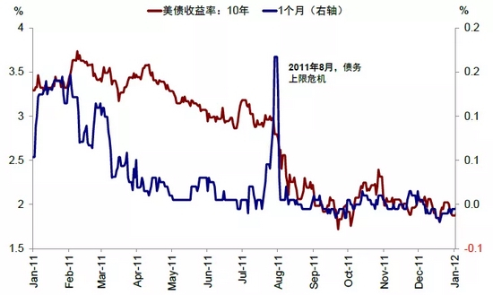 图表13:2011年8月债务上限危机时,短端利率明显上行,而长端利率因避险下行…