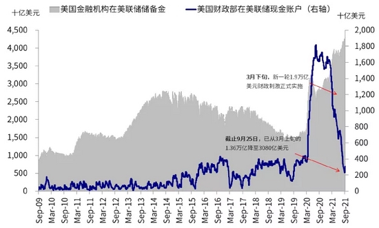 图表6:此前落地的财政刺激释放了大量TGA账户资金,当前TGA账户资金规模3447亿美元