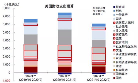 图表25:今年5月末,拜登政府向国会提交了2022财年预算方案,其中,预算支出总额约6万亿美元