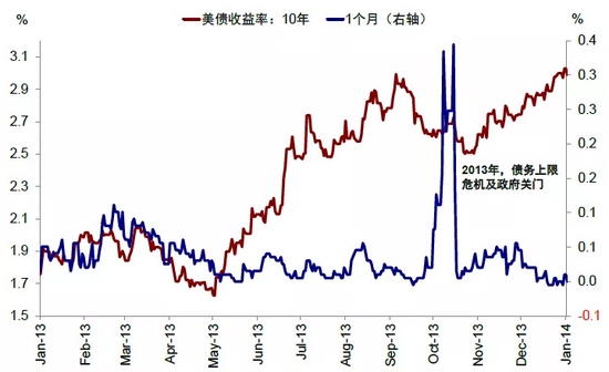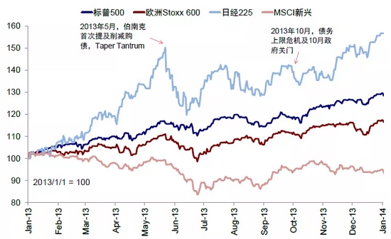 图表16:不过2013年基本贯穿全年的债务上限危机和10月份的政府关门对市场冲击相对较小,标普500指数下跌2.5%,而新兴市场并未受到影响