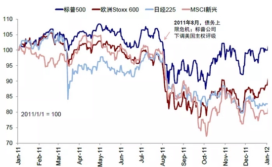 图表15:2011年8月债务上限危机和标普500公司下调美国主权评级使得两周之内标普500指数大跌近17%,全球其他市场也普遍受到波及