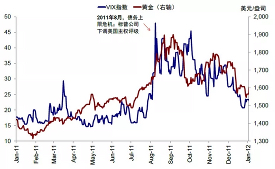 图表17:2011年期间,黄金和VIX指数均大幅攀升,避险情绪浓厚