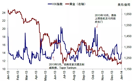 图表18:2013年10月VIX指数同样大幅攀升,但黄金基本没有明显反应