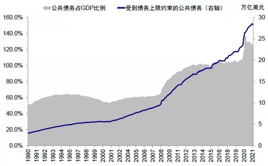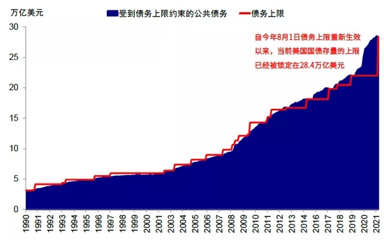 截止2021年8月末,美国联邦债务总额达28.4万亿美元,其中公众持有达22.3万亿美元[3],政府持有6.2万亿美元[4]。所以,债务上限可以变相理解为美国财政部手中的“信用卡额度”,美国财政部在不超过上限的情况下,可自行掌握发债节奏;触及上限后则无法进一步新增。