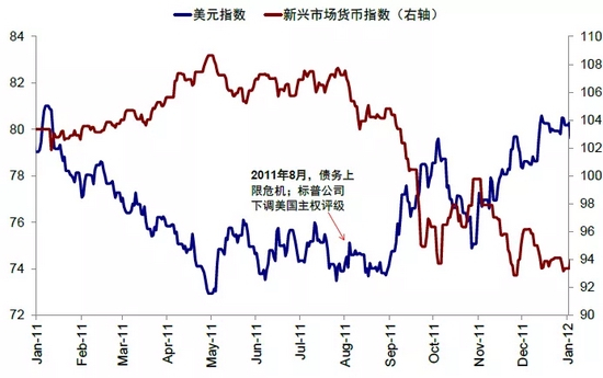 图表19:2011年期间,美元指数反弹,新兴市场货币指数走弱
